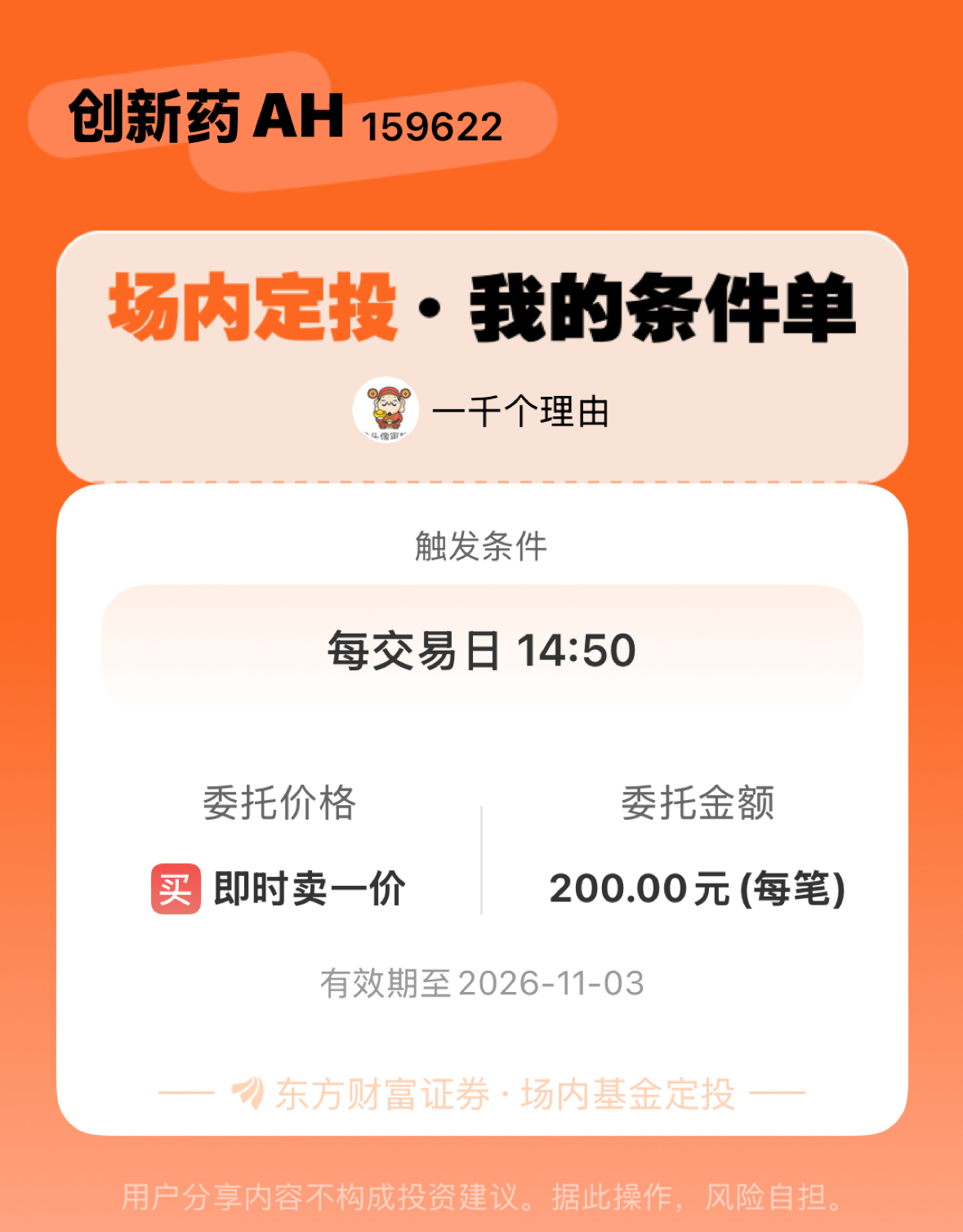 #条件单交流# #场内定投晒单# 一位股神设置了一个场内基金定投条件单,接下来就是见证奇迹的时刻~$创新药ETF沪港深(SZ159622)$