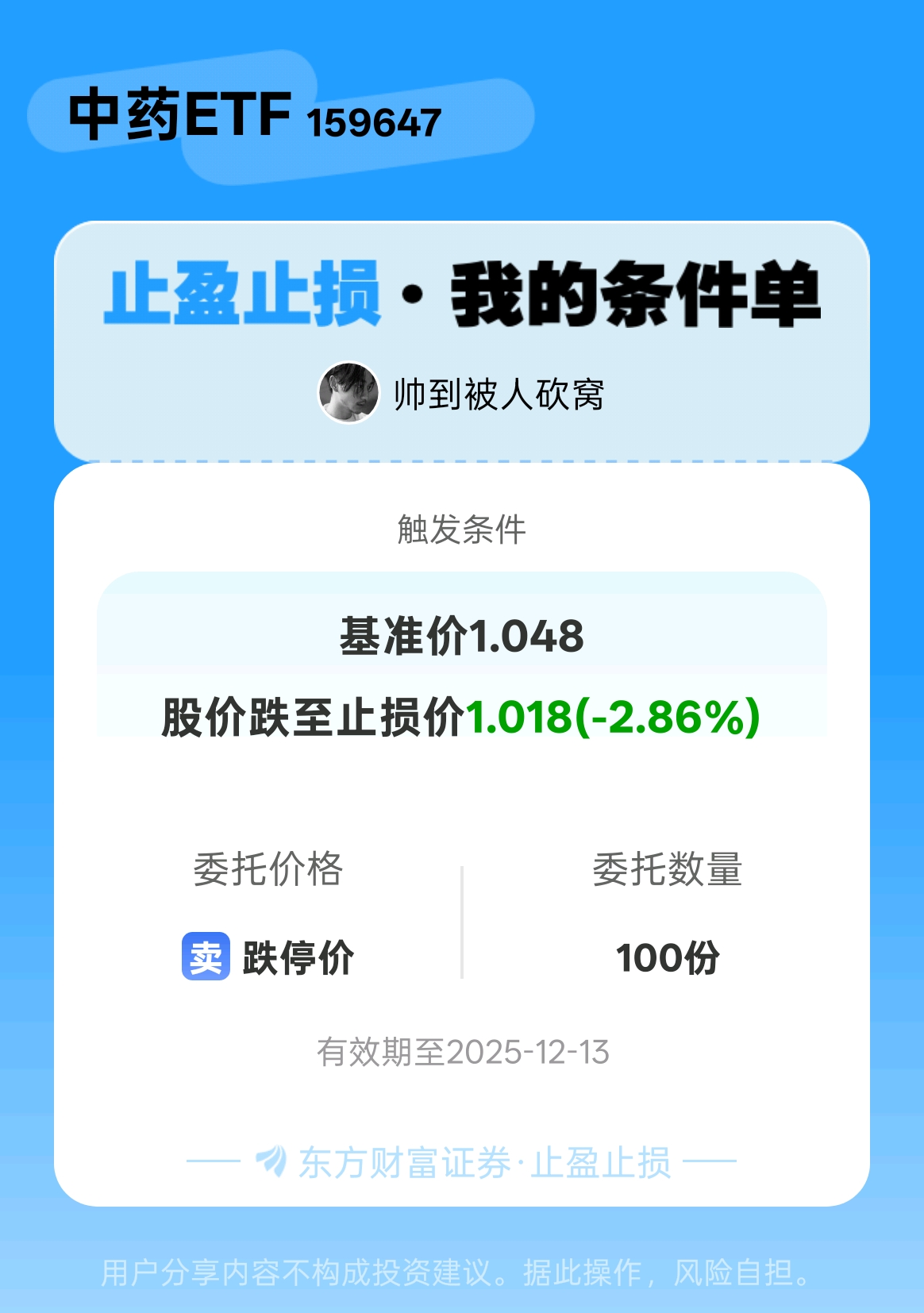 #条件单交流# #止盈止损晒单# 一位股神设置了一个止盈止损条件单,接下来就是见证奇迹的时刻~$中药ETF(SZ159647)$