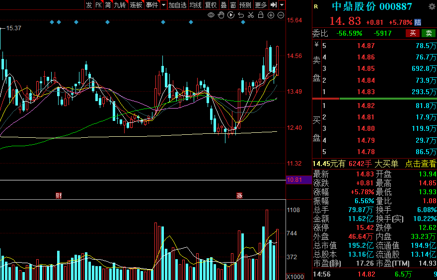 中鼎股份000887:中鼎股份,今天表现不错,属于放亮上涨,结合前面就是2阳包2阴,其实昨天意图已经很明显,洗掉一部分人,唯一不足是今天没能在前面高点,还差一点点,明天继续关注开盘情况是否能稳住,在去挑战10.8号的高点,如果亮能不能放,就先观望。