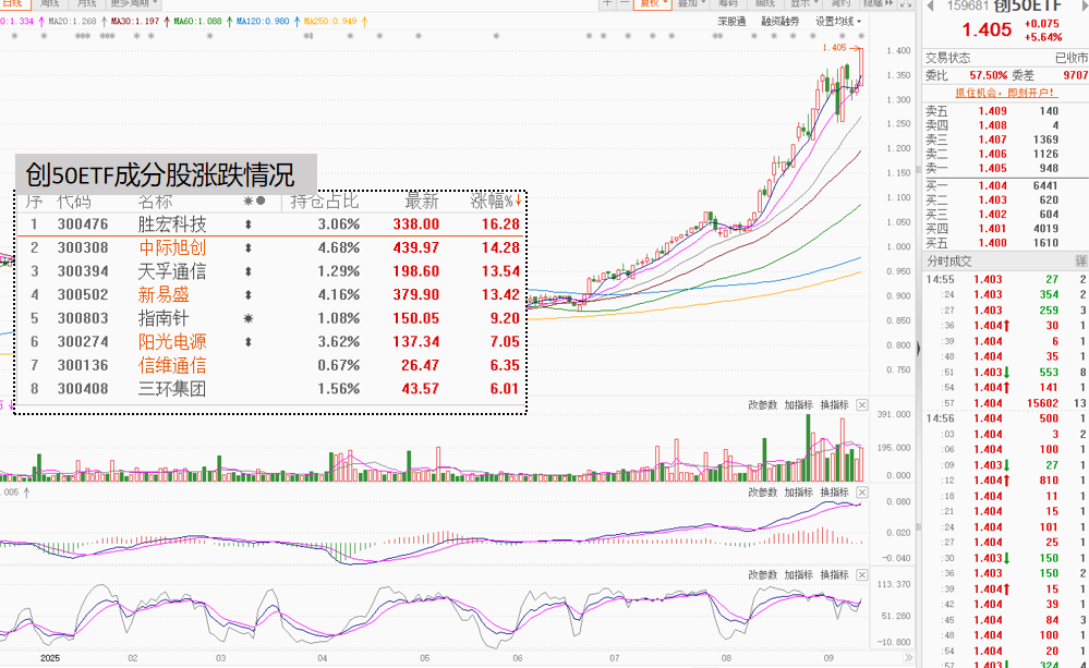目前,创50ETF(159681)有望进入强势多头行情。一方面,全球货币宽松环境为科技成长股提供估值支撑;另一方面,苹果产业链催化、AI算力需求爆发等实质性利好持续发酵。更重要的是,创业板50指数成分股均为各自领域的龙头企业,具备强技术壁垒和高成长潜力。中际旭创、新易盛等企业不仅受益于短期订单增长,更在光模块、PCB等细分领域占据全球领先地位,长期发展空间广阔。