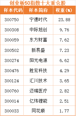 创业板50关联个股:宁德时代、中际旭创、东方财富、新易盛、阳光电源、胜宏科技、汇川技术、迈瑞医疗、亿纬锂能、同花顺。