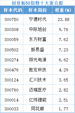 创业板50关联个股:宁德时代、中际旭创、东方财富、新易盛、阳光电源、胜宏科技、汇川技术、迈瑞医疗、亿纬锂能、同花顺。