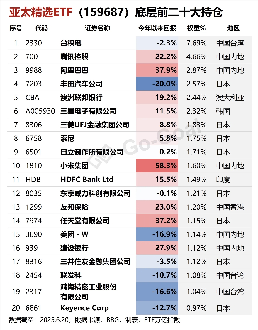 亚太精选成分股包括台积电,腾讯,阿里,三星电子,海力士,索尼,日立,京东威力,联