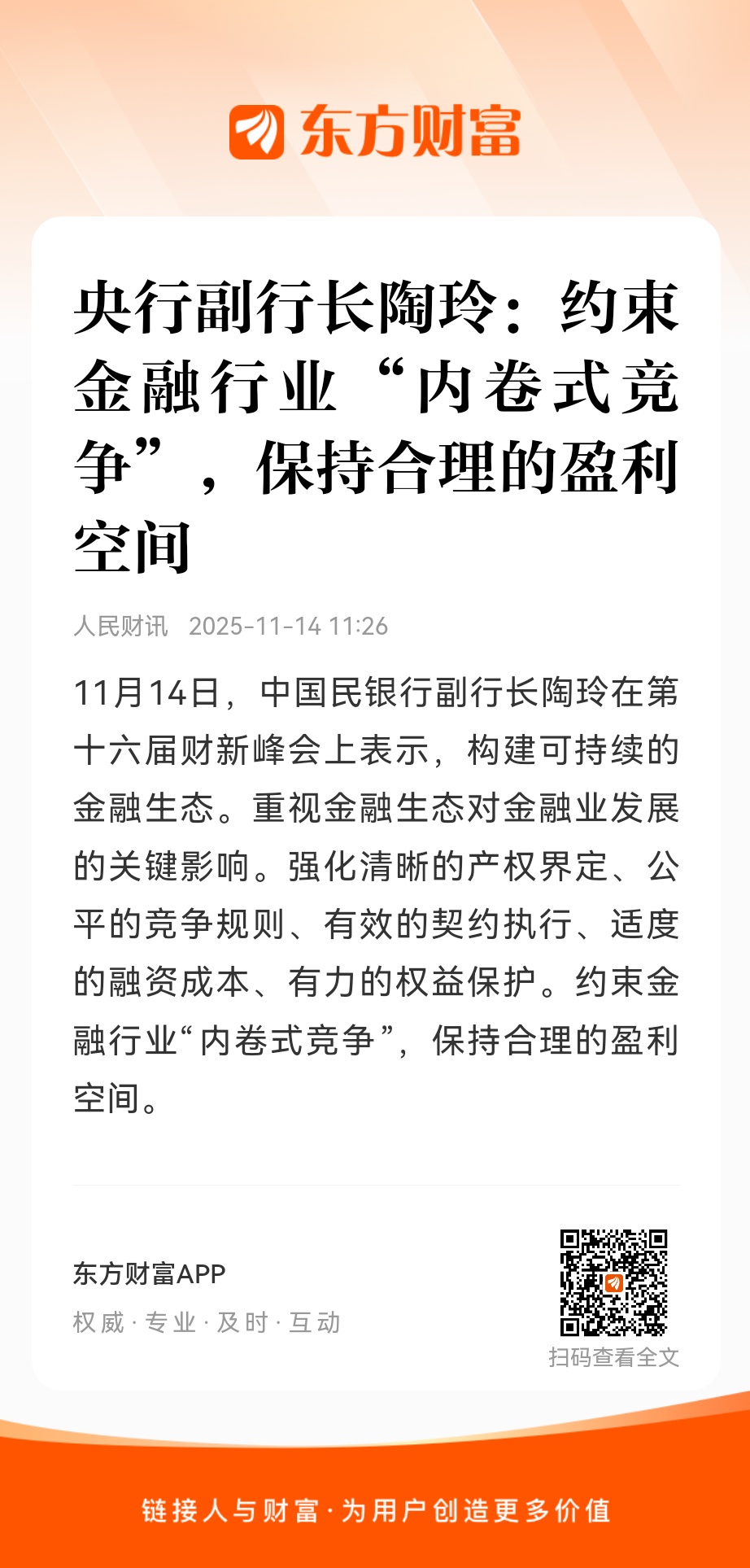 11月14日,中国人民银行副行长陶玲在第十六届财新峰会上表示,构建可持续的金融生态。重视金融生态对金融业发展的关键影响。强化清晰的产权界定、公平的竞争规则、有效的契约执行、适度的融资成本、有力的权益保护。约束金融行业“内卷式竞争”,保持合理的盈利空间。