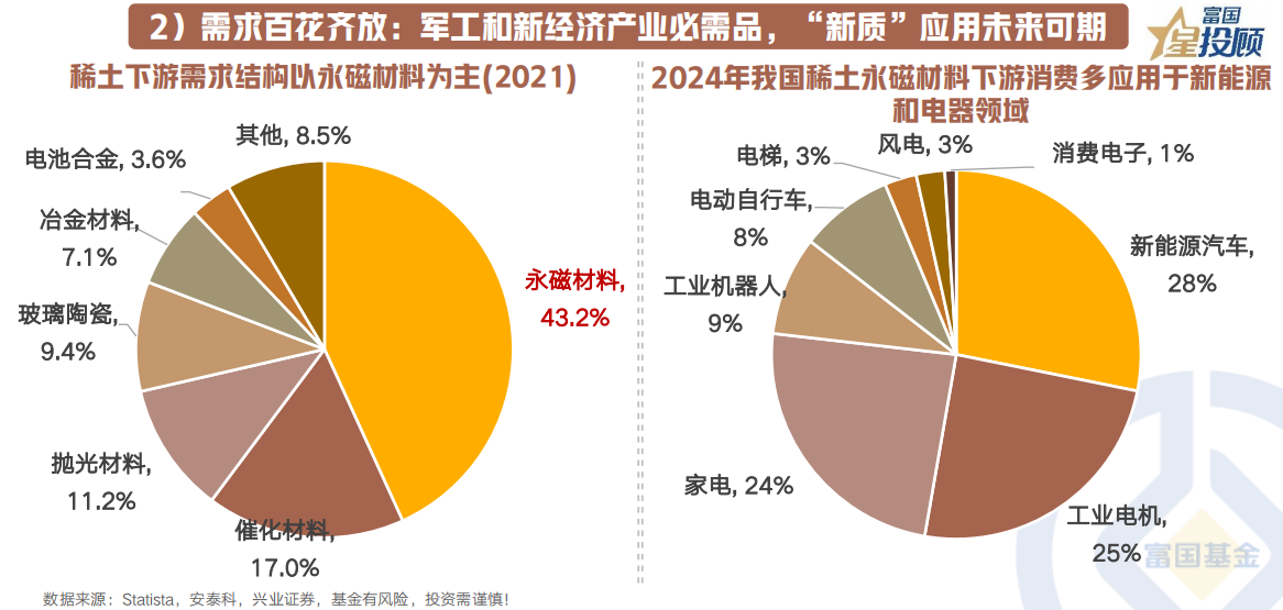 长期上,广泛应用于新能源和电器等领域的永磁材料是稀土最主要的下游需求方向。高科技制造+新经济产业背景下,无论是顺应低碳环保政策趋势的新能源汽车、风电、节能电机等产业,还是迎来量产元年的人形机器人、工业电机等板块,都将成为“新质”时代下的稀土需求和应用规模的新增长极。
