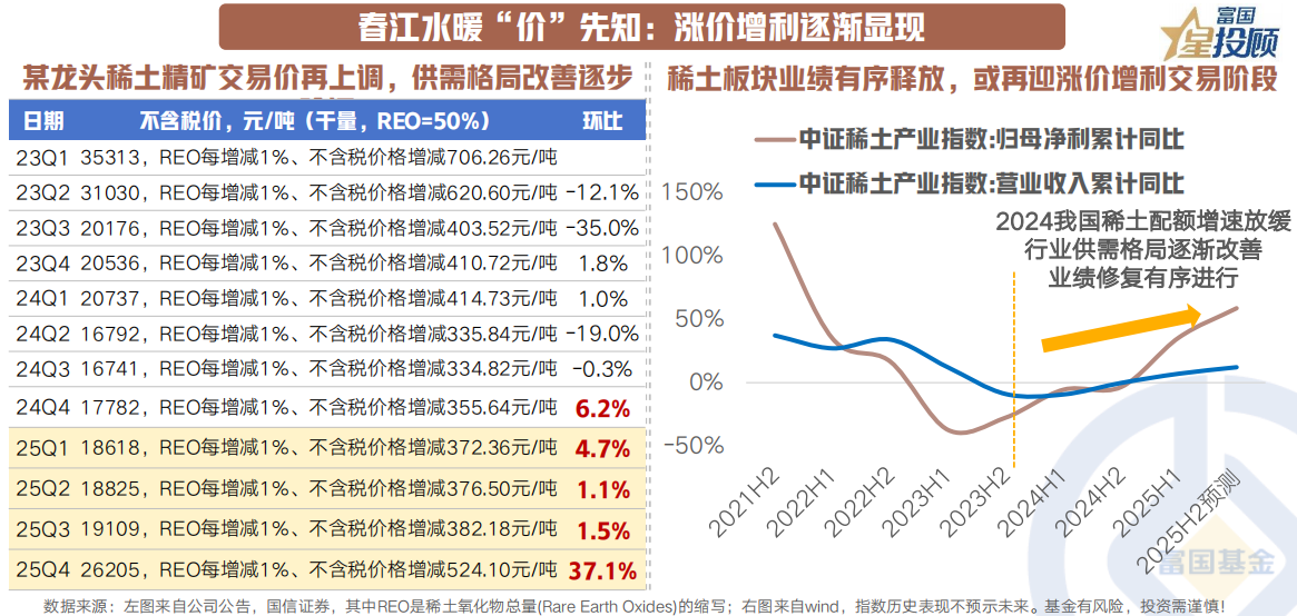 最终,春江水暖“价”先知。2025年以来某稀土巨头精矿交易不断提价(四季度环比增速甚至超30%),供需改善的正反馈最终将在价格上显现端倪,并持续修复行业利润。向后看,大国重器持续彰显其战略属性,在下游传统旺季备货预期之下,稀土产品价格有望继续上扬,叠加行业公司业绩释放或带动板块有序交易“涨价增利”,估值与业绩双升凸显其战略配置价值。
