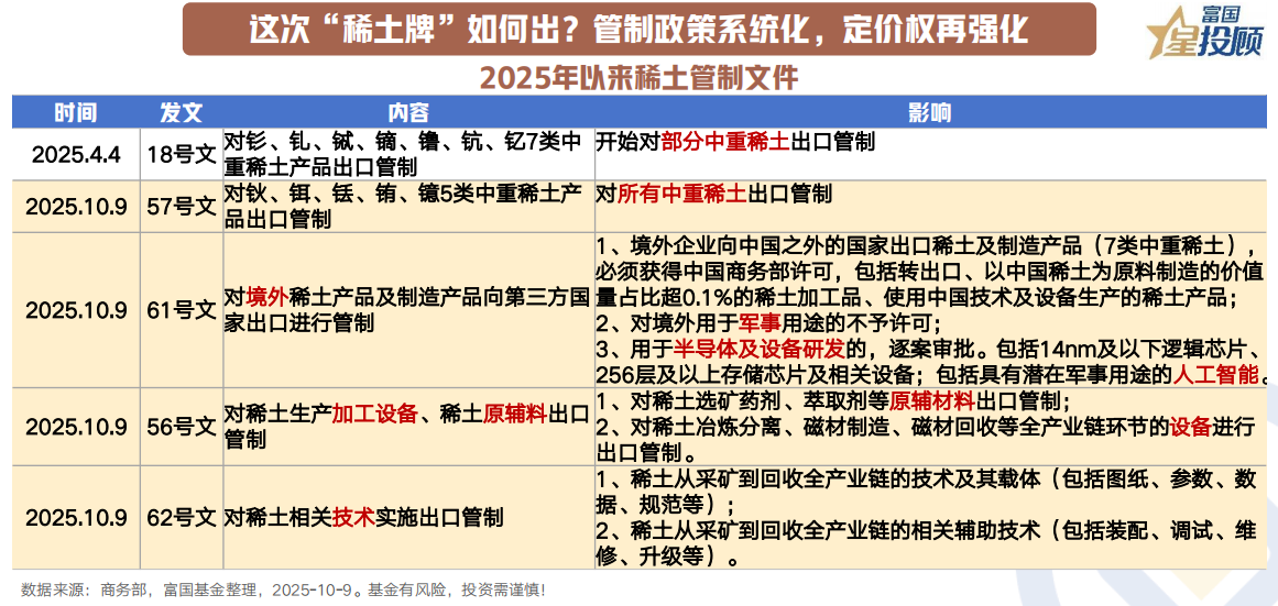 2025年10月9日,商务部联合海关总署等部门发布多项公告,对稀土相关物项、技术、设备及原辅料实施出口管制,管制范围从境内扩展至境外,基本覆盖稀土全产业链,并首次涉及半导体及人工智能领域,战略博弈价值再加强。