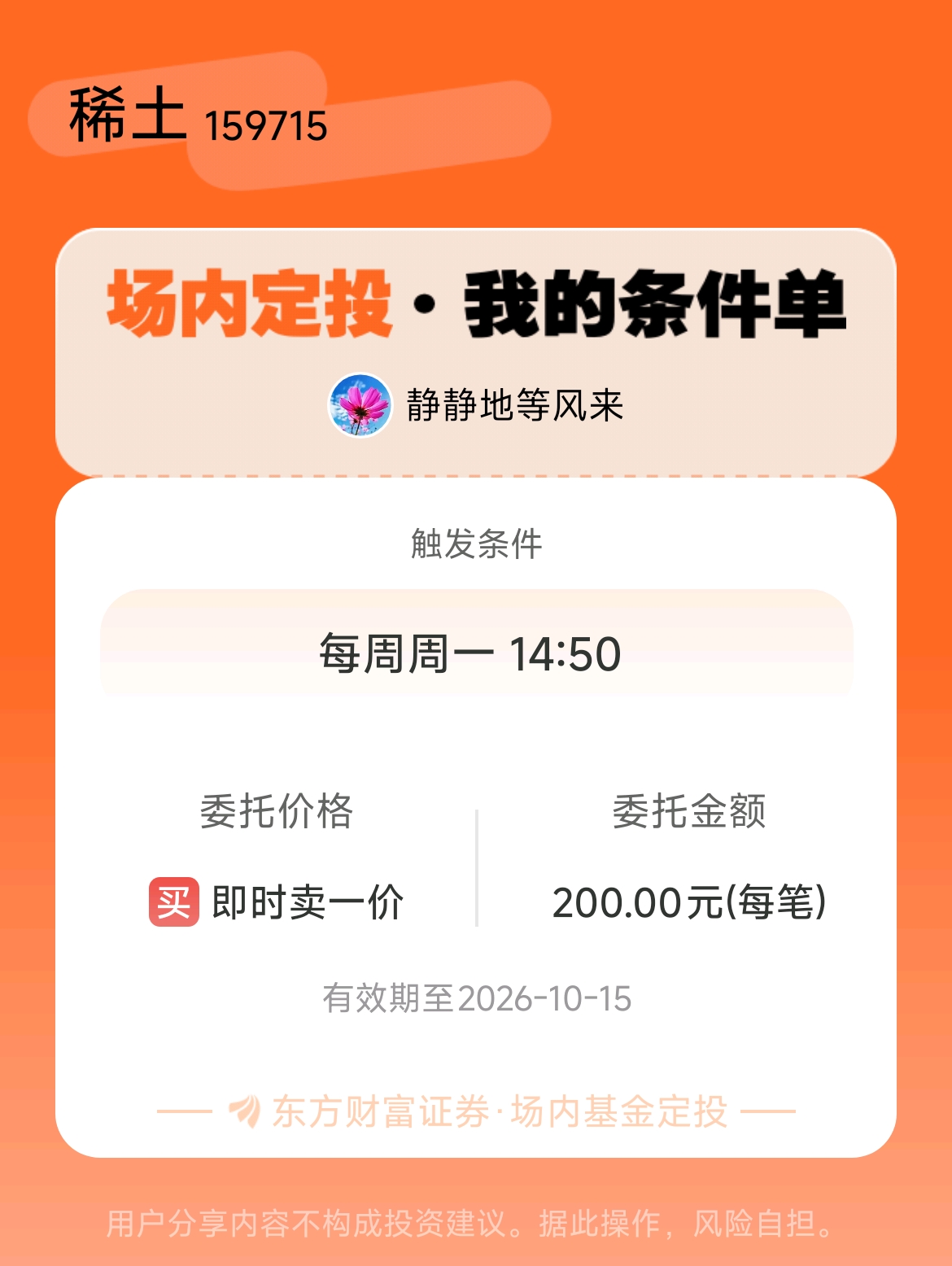 #条件单交流# #场内定投晒单# 一位股神设置了一个场内基金定投条件单,接下来就是见证奇迹的时刻~$稀土(SZ159715)$