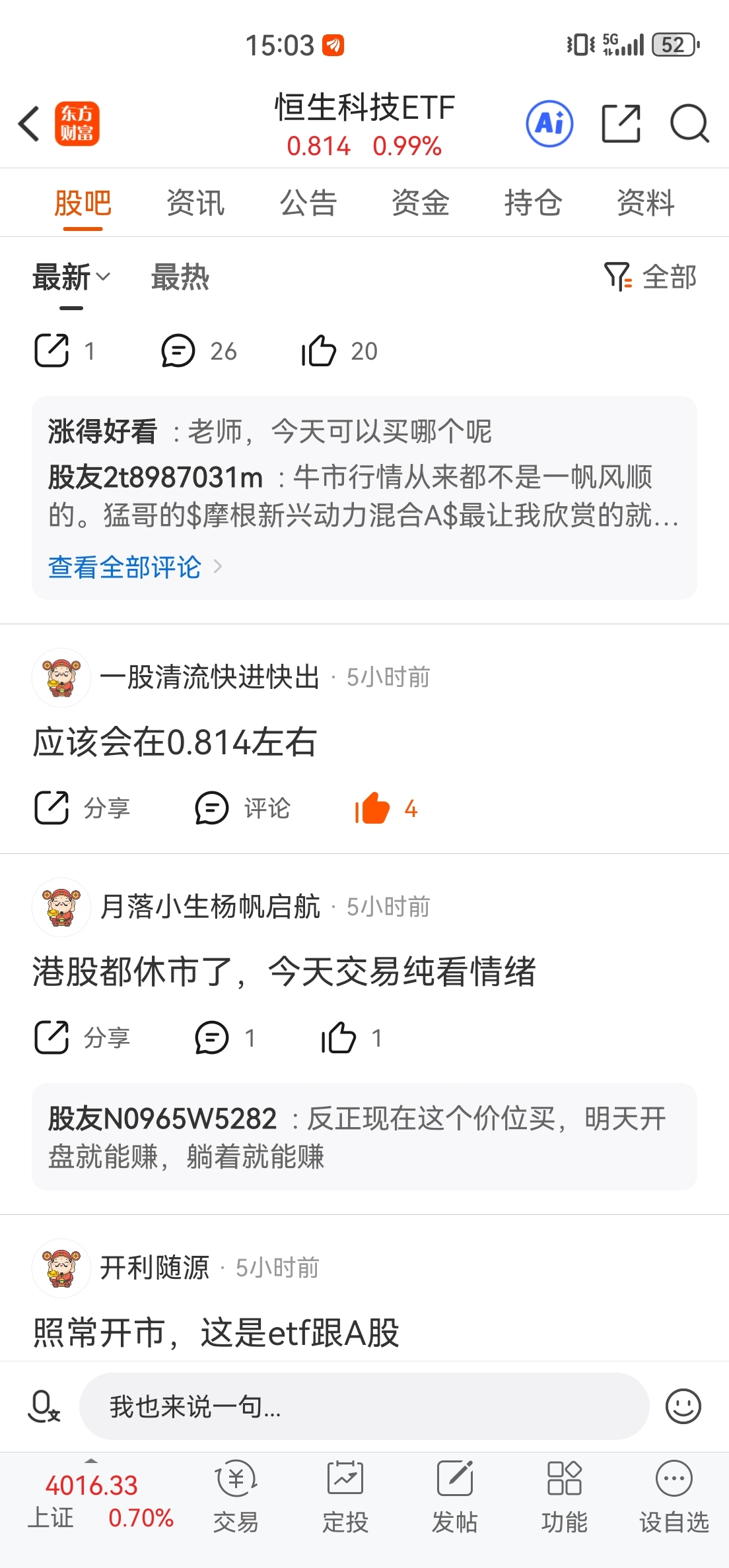 $恒生科技ETF(SZ159740)$ 就说在0.814左右。