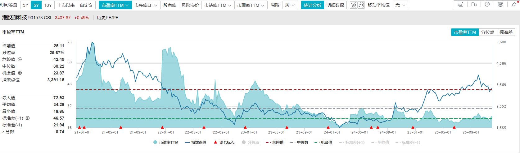 当前港股估值已接近“利空出尽”临界点。大国贸易摩擦的边际影响、海外流动性宽松交易的回摆效应,以及“外卖大战”对互联网板块盈利的短期冲击,均已在前期回调中完成风险释放。以港股通科技指数为例,其市盈率分位数已回落至过去五年25.67%水平,下行空间显著收窄。这种估值压缩并非单纯的市场悲观预期,而是多重风险因子共振后的“压力测试”结果——当负面因素被充分定价,市场自然进入“利空出尽”状态。