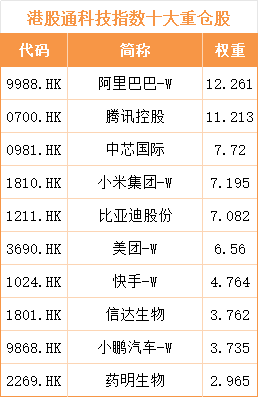 港股科技关联个股:阿里巴巴-W、腾讯控股、中芯国际、小米集团-W、比亚迪股份、美团-W、快手-W、信达生物、小鹏汽车-W、药明生物。