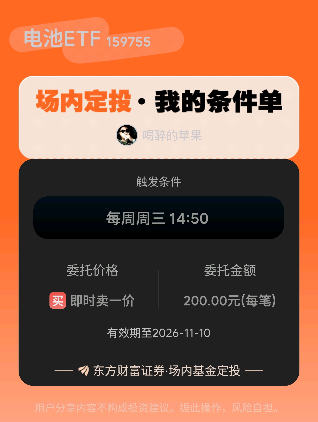 #条件单交流# #场内定投晒单# 一位股神设置了一个场内基金定投条件单,接下来就是见证奇迹的时刻~$电池ETF(SZ159755)$
