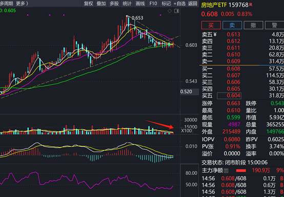 周线仍在下降趋势中,日线缩量下跌,暂时在0.595处获得支撑,窄幅横向支撑,均线