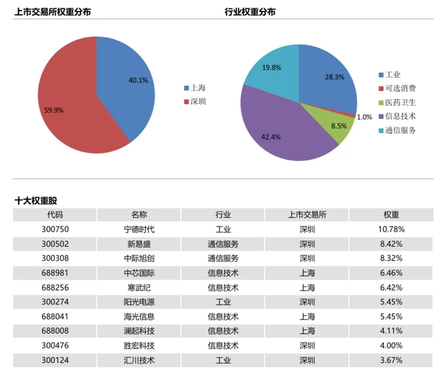 行业分布上,科创创业50成份股中,信息技术占42.4%,工业占28.3%,通信服务占19.8%,医药卫生占8.5%,上述行业合计占99%,基本全是政策重点支持或发展的骨干行业。