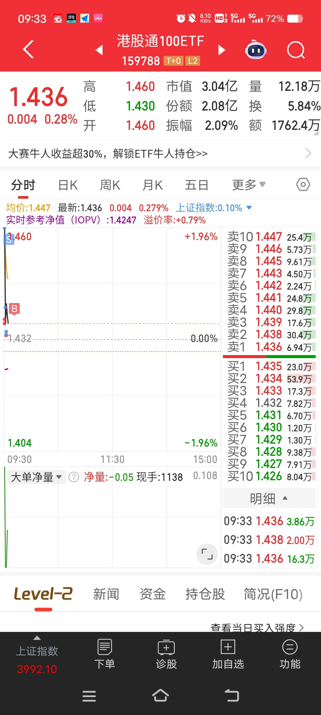 $港股通100ETF(SZ159788)$ 两亿多的份额,还以为和之前一样?开盘全部砸给你们,昨天申购了一亿的份额,吃像属实难看