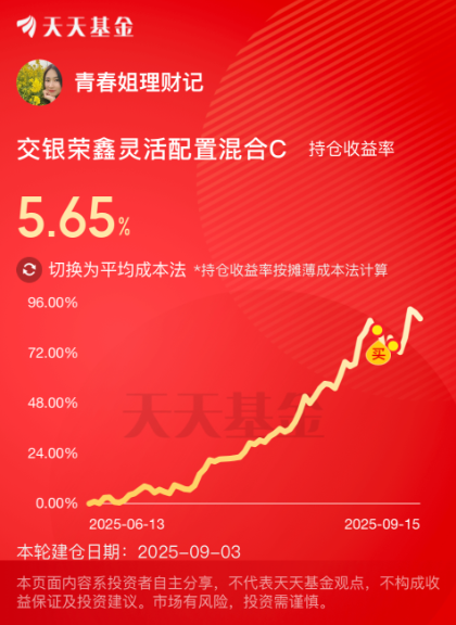我加仓$交银荣鑫灵活配置混合C(OTCFUND|019514)$1000元,发车前去基金详情页面领了3元包包,省到就是赚到!荣鑫重仓科技和新能源,科技是今年确定的大主线,新能源是近期接力新主线,不得不说经理的眼光还真不错,紧紧抓住了半导体芯片、CPO通信、AI算力、汽车等上涨行情,近3个月就涨超了88%,爆发力太强啦!