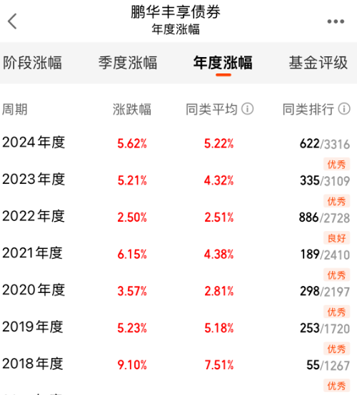 丰享持仓有80%的中高等级信用债,久期多为3-5年,长期业绩表现优秀,已获得晨星五星评级,也入选了债券热基收益榜单,毕竟成立以来8年多以来年年都是正收益,累计涨了48.21%,今年震荡行情是个不错的低吸机会!