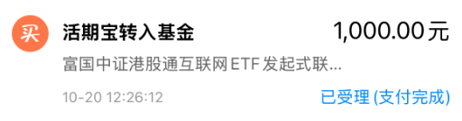 进入10月以来调整了不少,趁还没涨太多我抓紧加仓一笔,我加仓$富国中证港股通互联网ETF发起式联接C(OTCFUND|014674)$1000元,跟踪的港股互联网指数这会看涨2.9%左右,这个月调整了10几个点,再加上本身港股互联网指数估值就处在历史低位,青春认为今天反弹是刚开始,后续修复空间还比较大,可以上车,富国港股互联网已入选热基定投榜,我也积极布局。$富国中证港股通互联网ETF发起式联接A(OTCFUND|014673)$