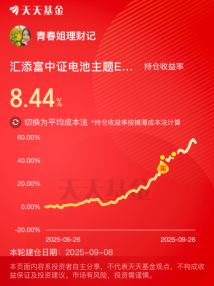 宝子们,买对了!持仓的$汇添富中证电池主题ETF发起式联接C(OTCFUND|012863)$前面加仓、今天吃大肉!跟踪的CS电池指数上周五刚小调整一天,今天盘中一度大涨超6%、续创年内新高,虽然今年以来涨不少了,但站在中长期维度来看,指数距离收复2022年阴线还有很大的空间,所以我会耐心持基过节,继续看好估值修复上涨行情。