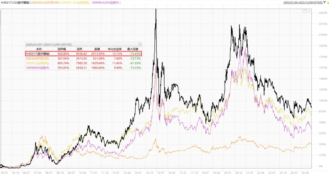 Wind数据显示,自指数基日以来到现在,医疗器械指数的累计涨幅是920.80%,年化收益12.12%,这两项数据均要优于同期的沪深300这样的宽基指数,以及中证医疗和全指医药这样的同类型指数。