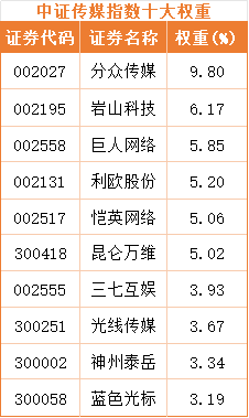 传媒板块关联个股:分众传媒、昆仑万维、三七互娱、蓝色光标、恺英网络、神州泰岳、岩山科技、利欧股份、芒果超媒、巨人网络。