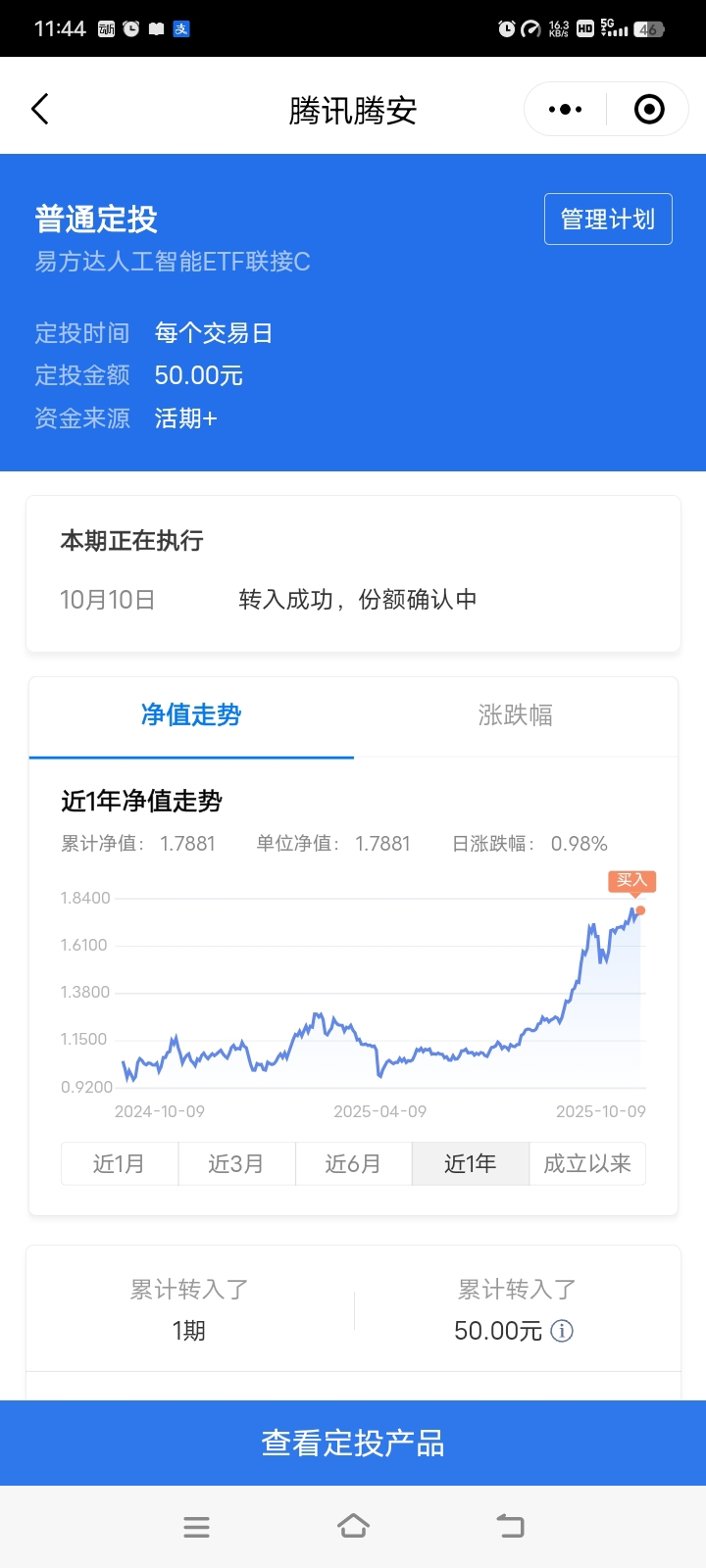 $人工智能ETF(SZ159819)$ 每个交易日定投50,坚持两年看看结果怎么样