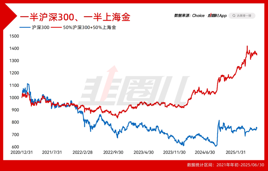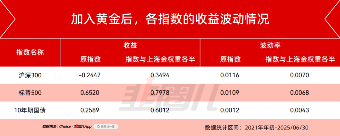 而如果2021年年初,沪深300指数和上海金指数权重各半,那么收益率会提高至34.94%,波动率反而降至0.7%。