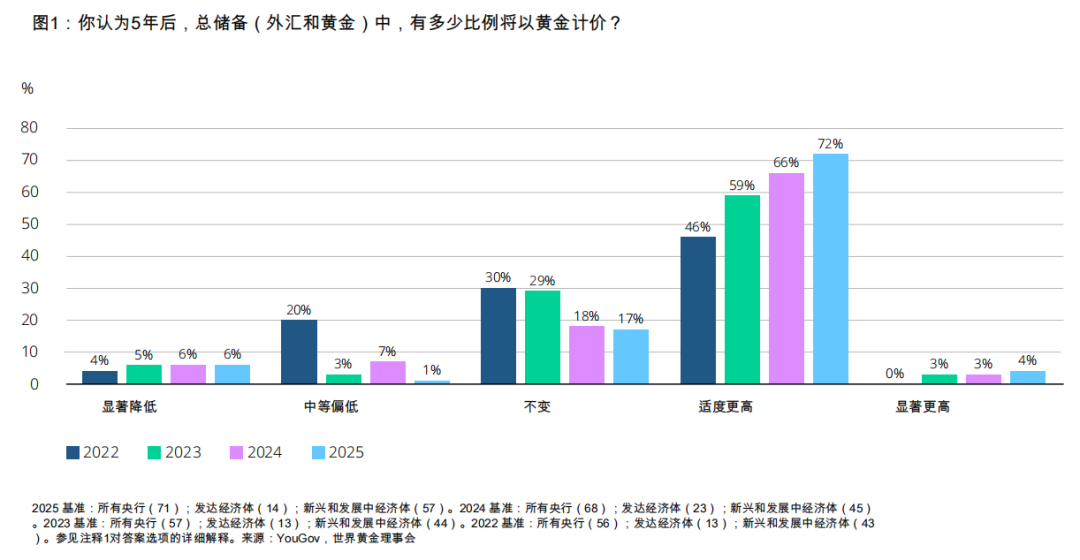 首先,76%的受访者认为,五年后黄金在央行官方储备中的占比,会有所提高(72%适度提高+4%显著提高)。