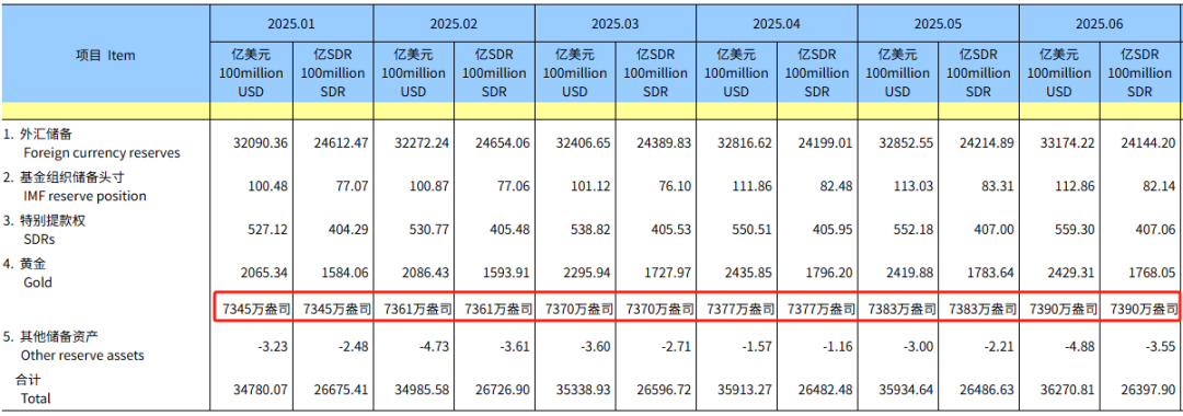 以中国为例,2025年前6个月,央行持续增持黄金,从1月份的7345万盎司,增长至6月份的7390万盎司。