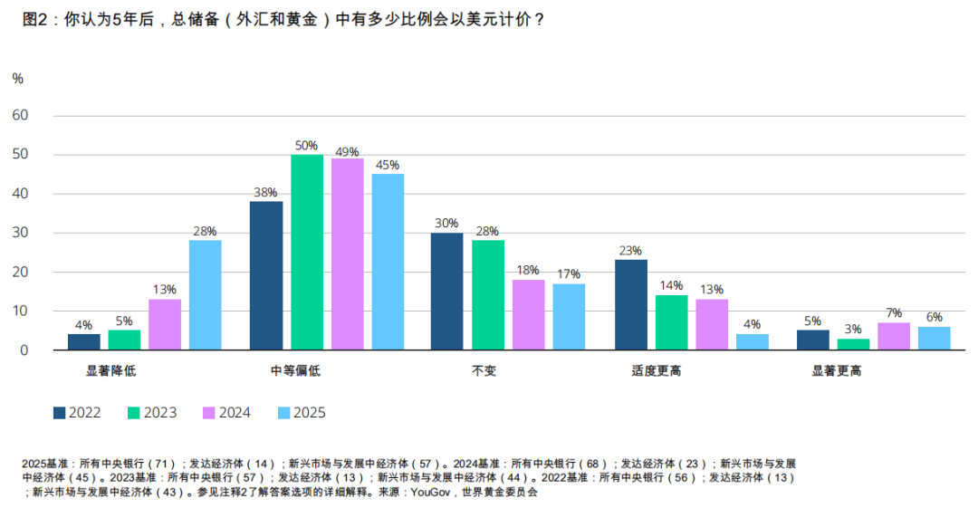 反观美元资产,73%的受访者认为,五年后美元在央行官方储备中的占比,会出现下滑,其中认为会出现显著下滑的比例,更是接近30%。