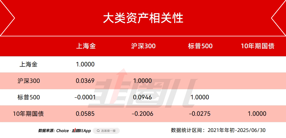 我统计了4类资产,沪深300、标普500、10年期国债、上海金,自2021年以来(截至2025年6月30日),日收益率的相关性。