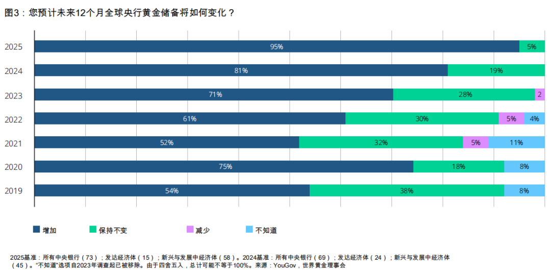 最后,在问到对未来1年央行黄金储备的展望时,约95%的受访者认为,央行会增持黄金。