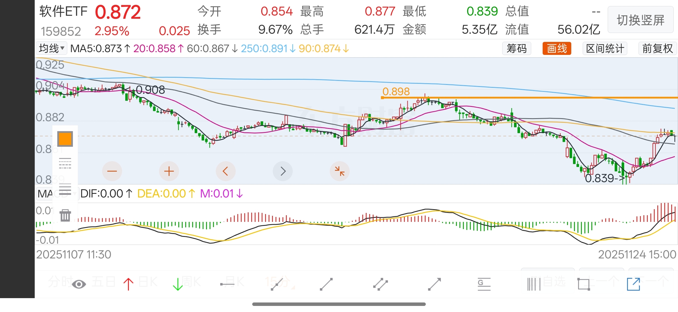 $软件ETF(SZ159852)$ 反弹有量,15分钟上零轴,15分钟底背离,反弹第一目标可看到0.898附近