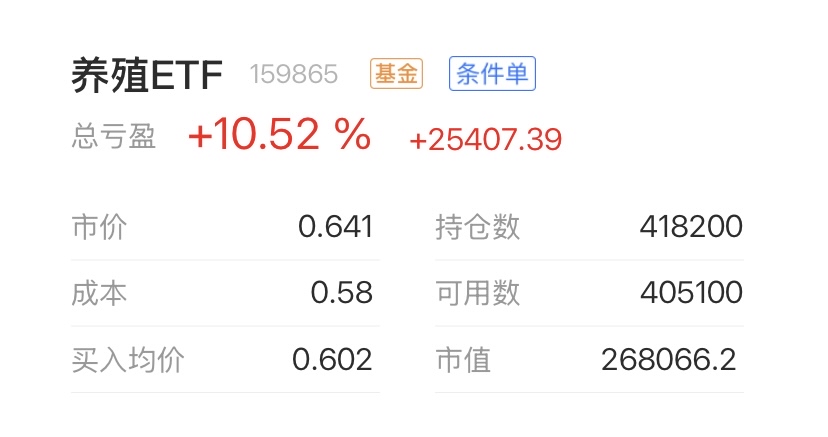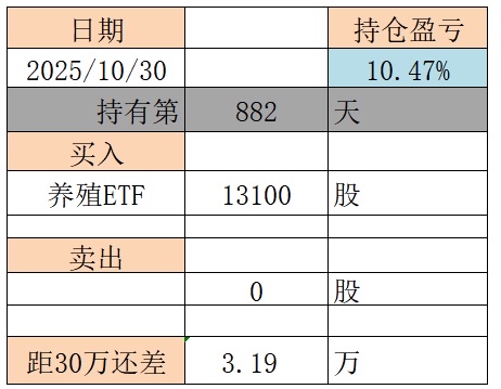 养殖ETF定投第882天买入13100股,卖0股累计盈亏:+25407.39