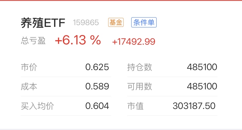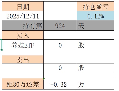 养殖ETF定投第924天买入0股,卖0股累计盈亏:+17492.99