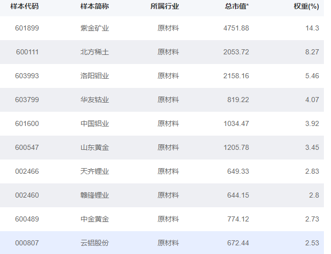 有色板块关联个股:紫金矿业、中国铝业、北方稀土、洛阳钼业、华友钴业、赣锋锂业、山东黄金、天齐锂业、中金黄金、云铝股份。