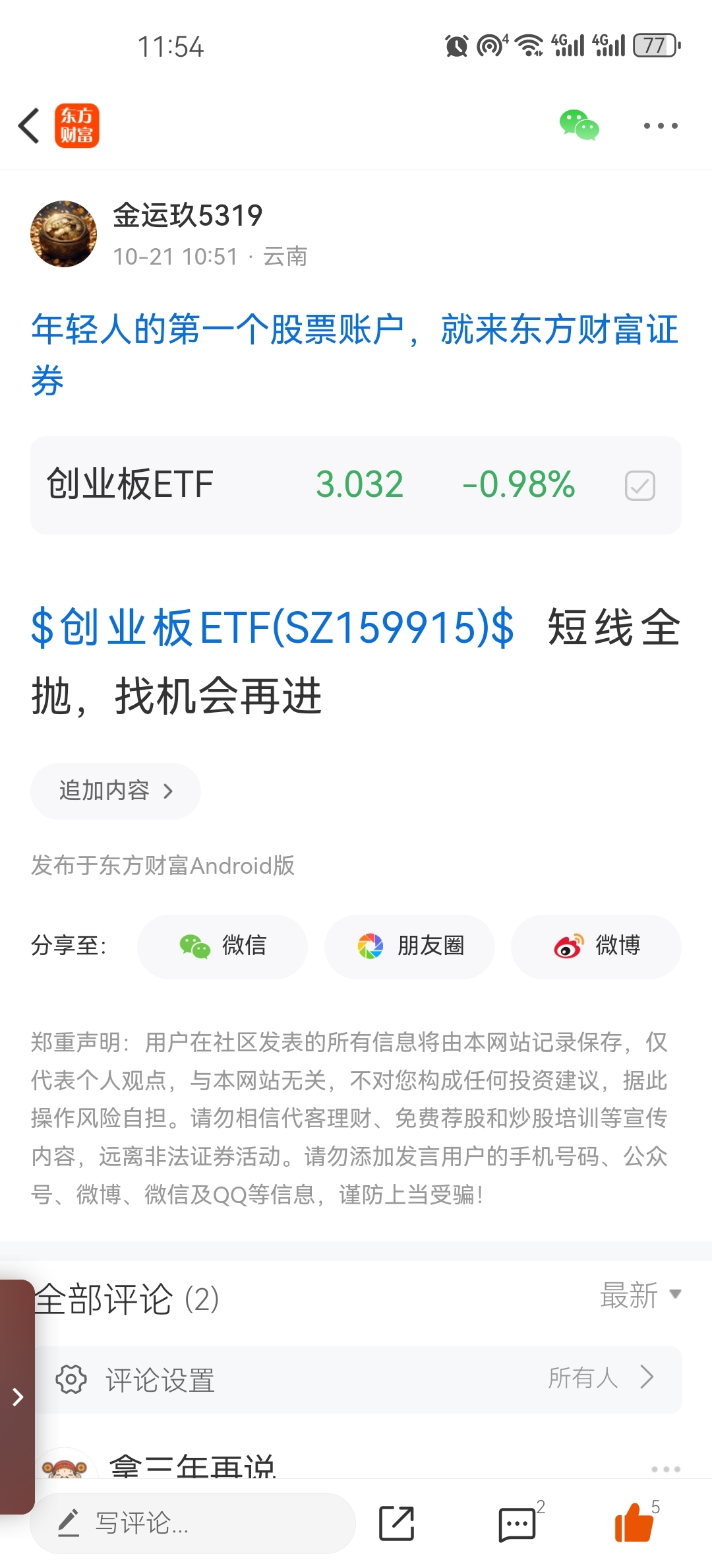 $创业板ETF(SZ159915)$ 上周五加短线仓部分昨天高点全抛,很快要到我第一防守位,能守住短线接回,不能守住长线仓位我也要减半回避,到第二防守位去接回,操盘不分好坏,唯一就是要严按自己看得懂的方法去执行,不报任何侥幸心理,做错的时候也必须及时纠正