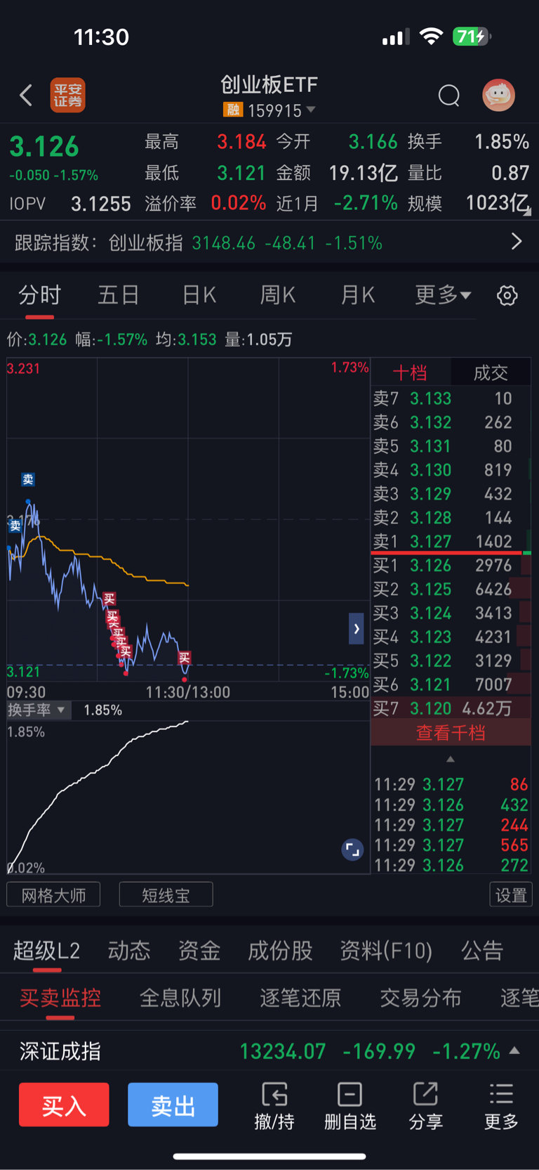 $创业板ETF(SZ159915)$ du钱嘛,没事,反正昨天进的今天还赚,大家都知道指数不能太难看,大家也知道下午盘都比较容易拉,花不了几个钱就能拉升,所以没动手的盯着下午盘,只要比现在还出坑,买就是,明天随便获利就出即可。