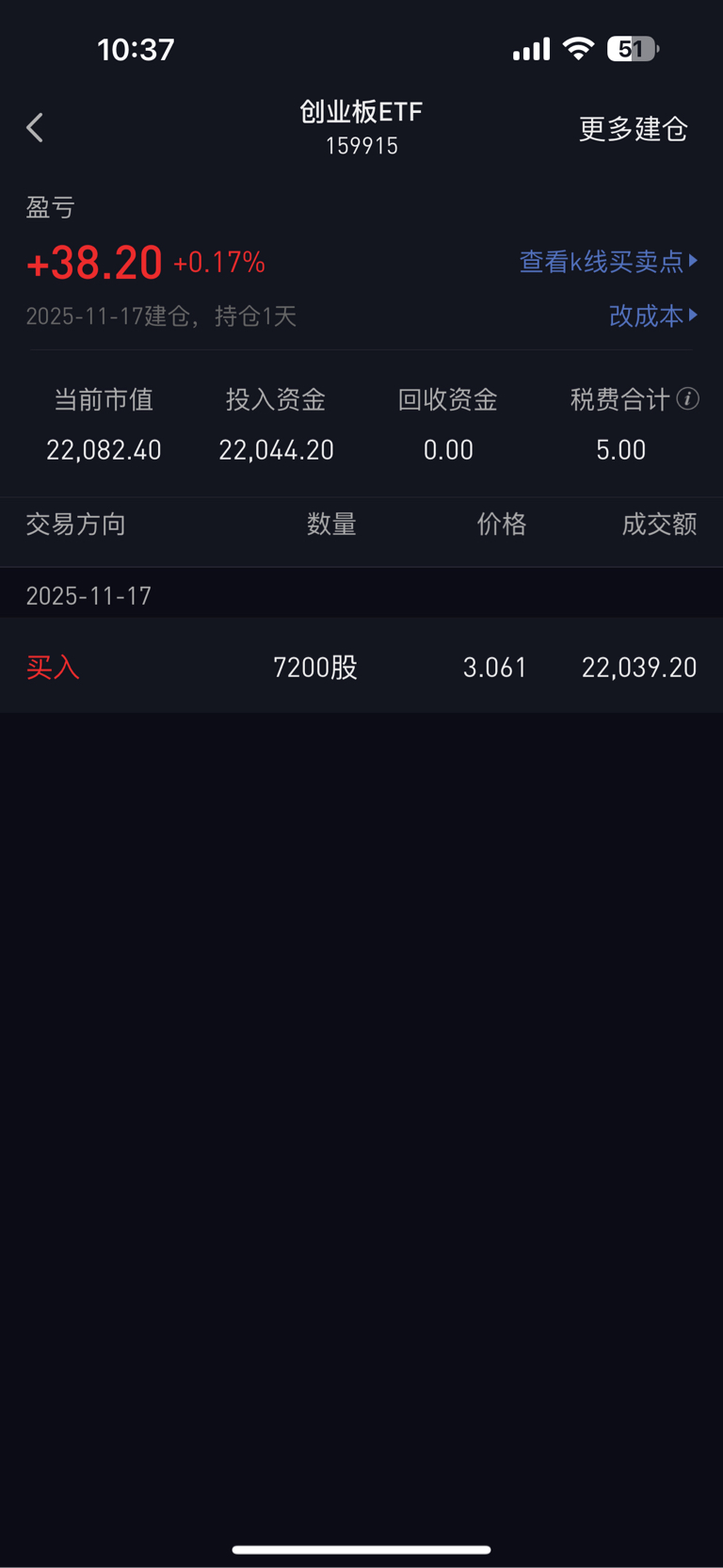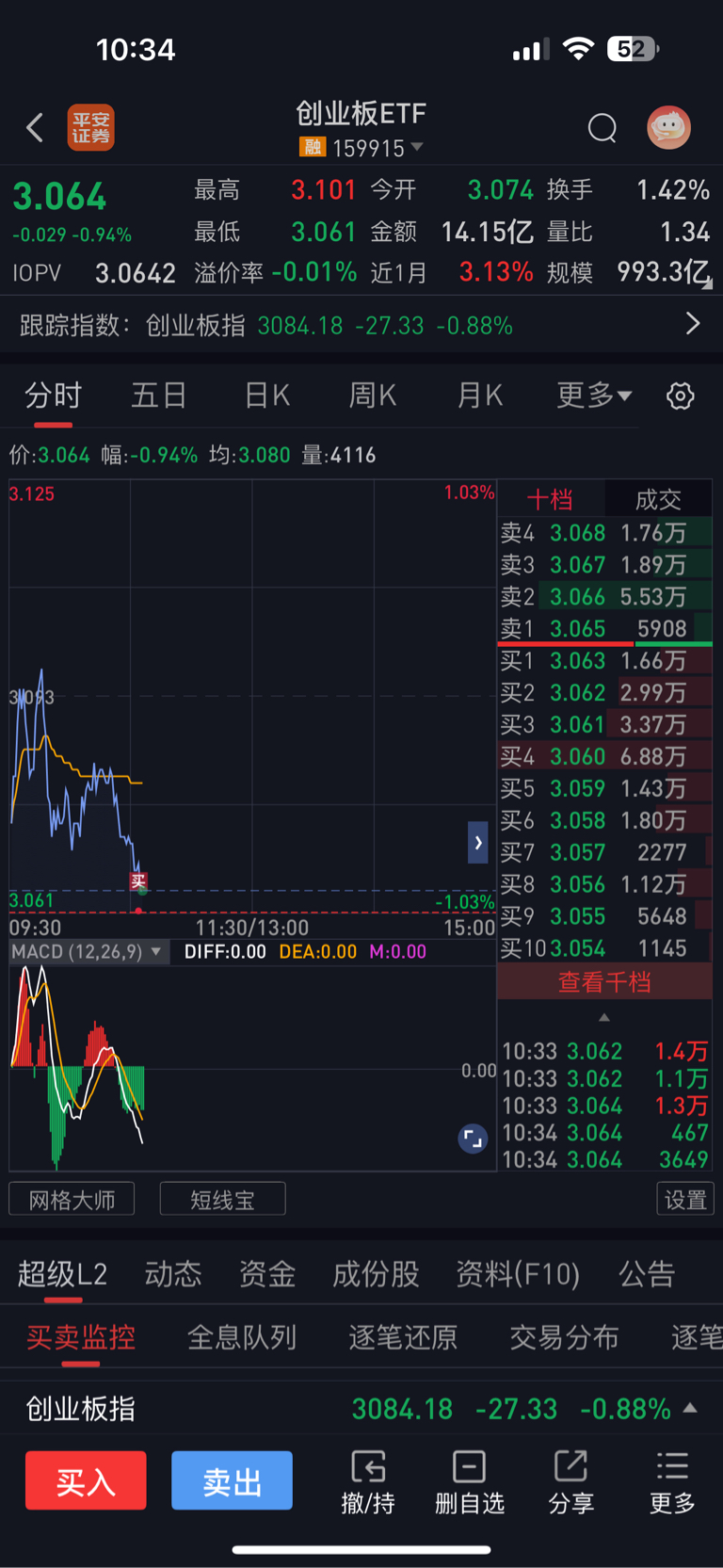 $创业板ETF(SZ159915)$ 今天的第一手,买的少,无论不管多少,获利就走,哪怕只有一百块,这个市场就值这样投资。来,主力下来试试我其他的单子。