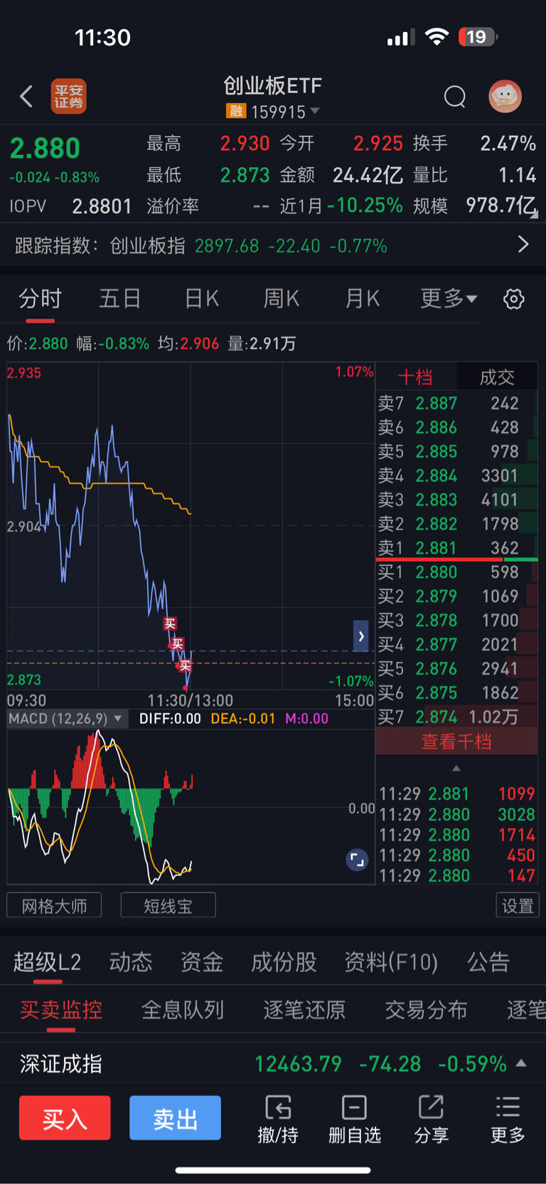 $创业板ETF(SZ159915)$ 200多手目前,来吧,我看看今天能否把均价打到2.865,打的到的话,880明天就开始卖,再次归来支持指数,下面单子多,主力,我等你收盘前半小时的坑,看看能到哪。