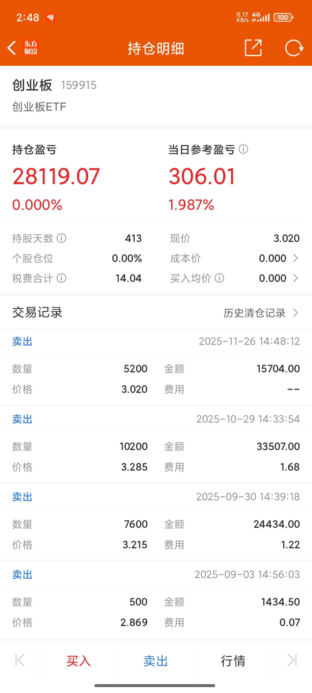$创业板ETF(SZ159915)$ 清仓,持有一年多,涨幅满足。#炒股日记#