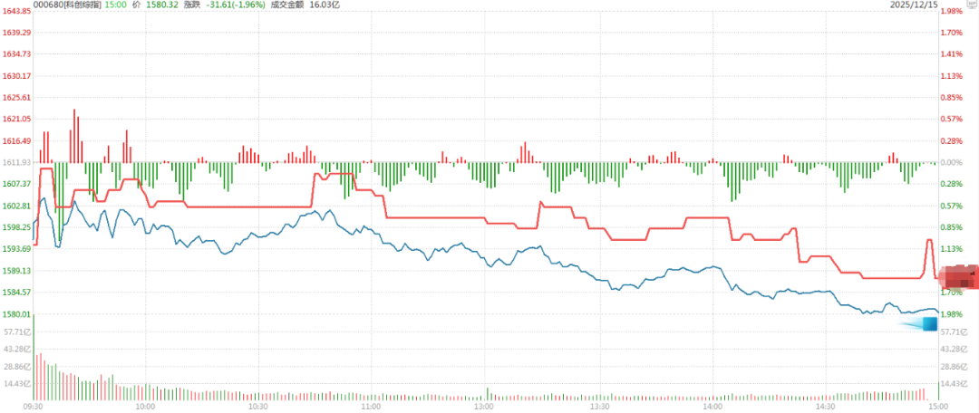 举个例子,下图为12月15日,跟踪科创综指的某基金(红线)的盘中走势,对比科创综指(蓝线)就不太准,甚至很长时间都没有成交,流动性不足。