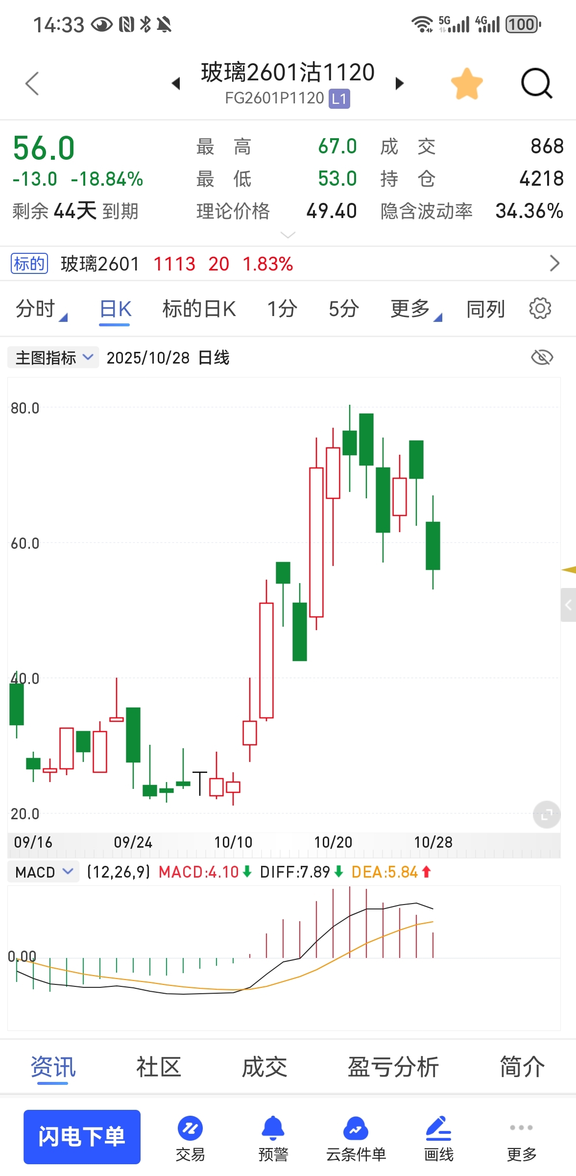 我看多玻璃连续(FG0)玻璃期权明天会不会翻倍就看他了。加油加油。任枯要大跌了。