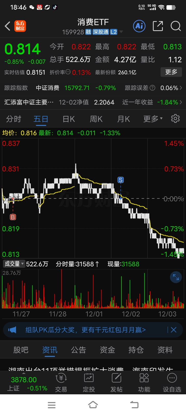 $消费ETF(SZ159928)$ 买在起涨点,既然不涨就有问题,果断卖掉,亏了个手续费,马上换到中药ETF起涨点去了……