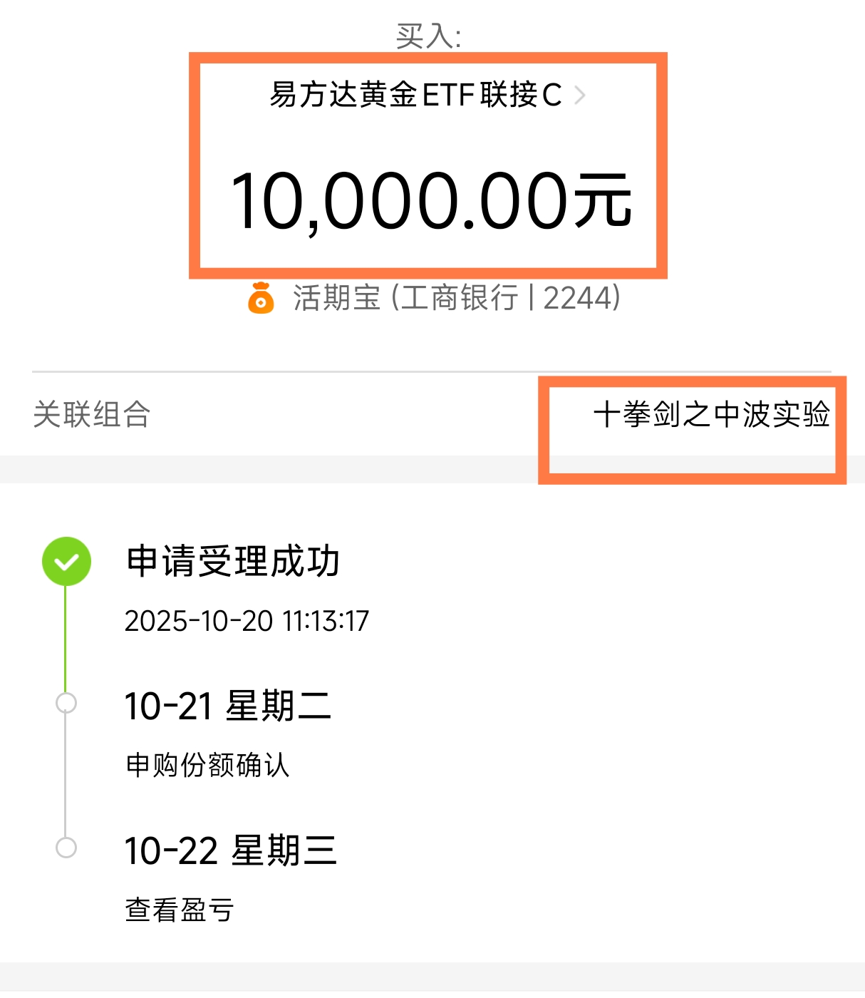 今天这1万元的易方达黄金全部加到了十拳剑之中波实验这个公开实盘里,天天基金app阅读这个帖子的时候,顶部就有实盘链接。每笔交易都是清清楚楚,拒绝忽悠!