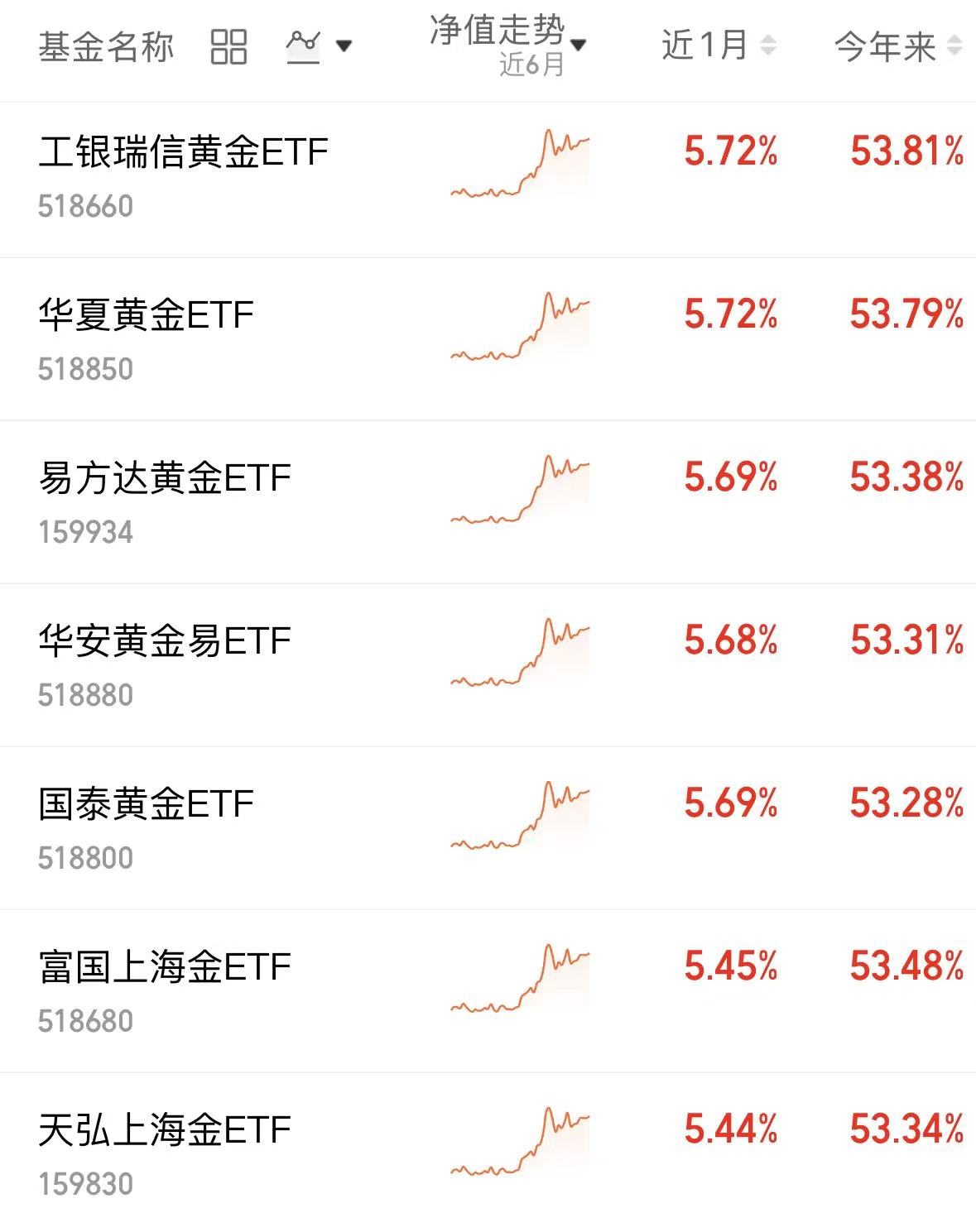 黄金目前高位震荡,建议控制仓位并以资产配置的理念长期持有。$黄金ETF基金(SH518660)$  是持有费率最低的黄金ETF,合计持有期间费率只有0.2%,是其他黄金ETF的三分之一,今年以来业绩是所有黄金ETF的第一名(如图,截止11月28号),每年比其他高费率黄金ETF多赚0.4%左右。
