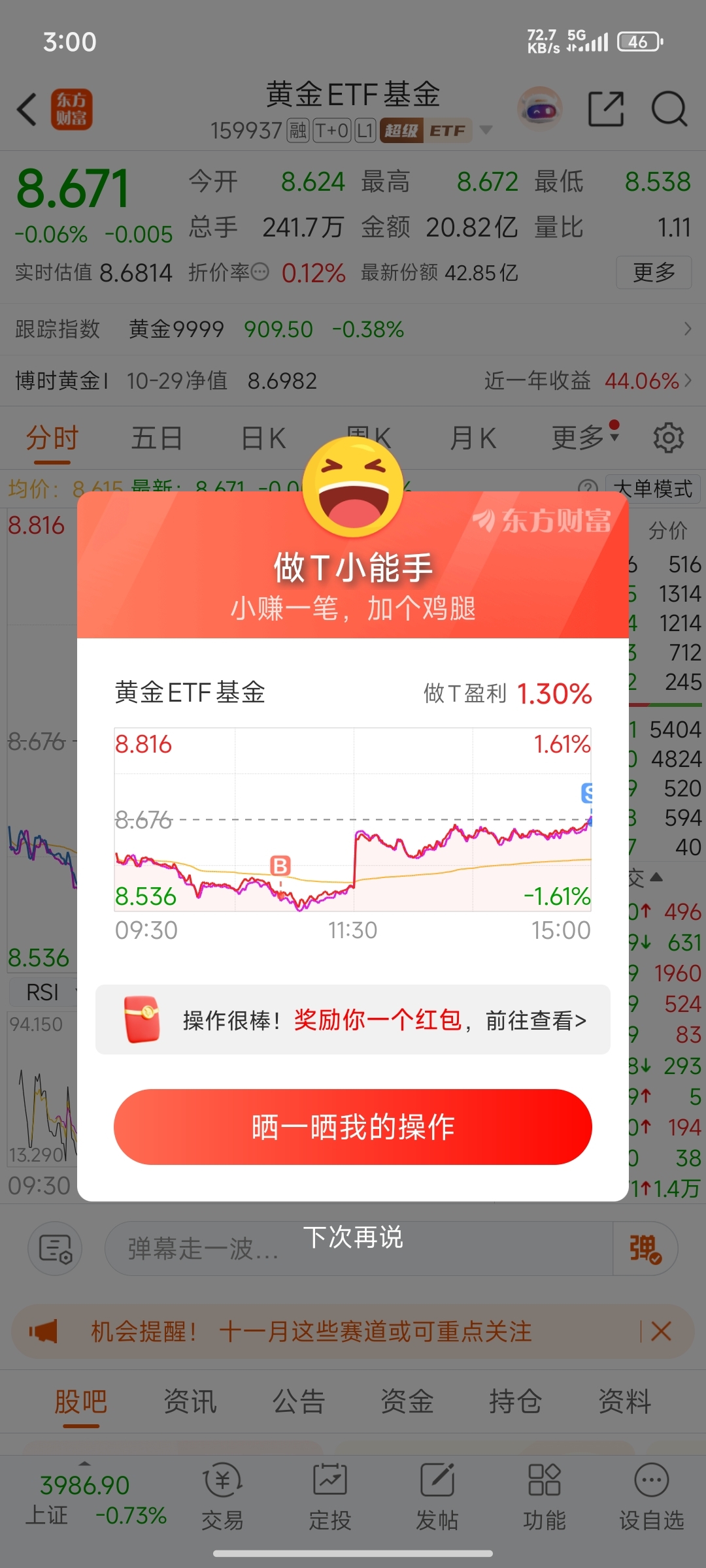 $黄金ETF基金(SZ159937)$ 今天这操作还是可以的,当然明天要是高开就打脸