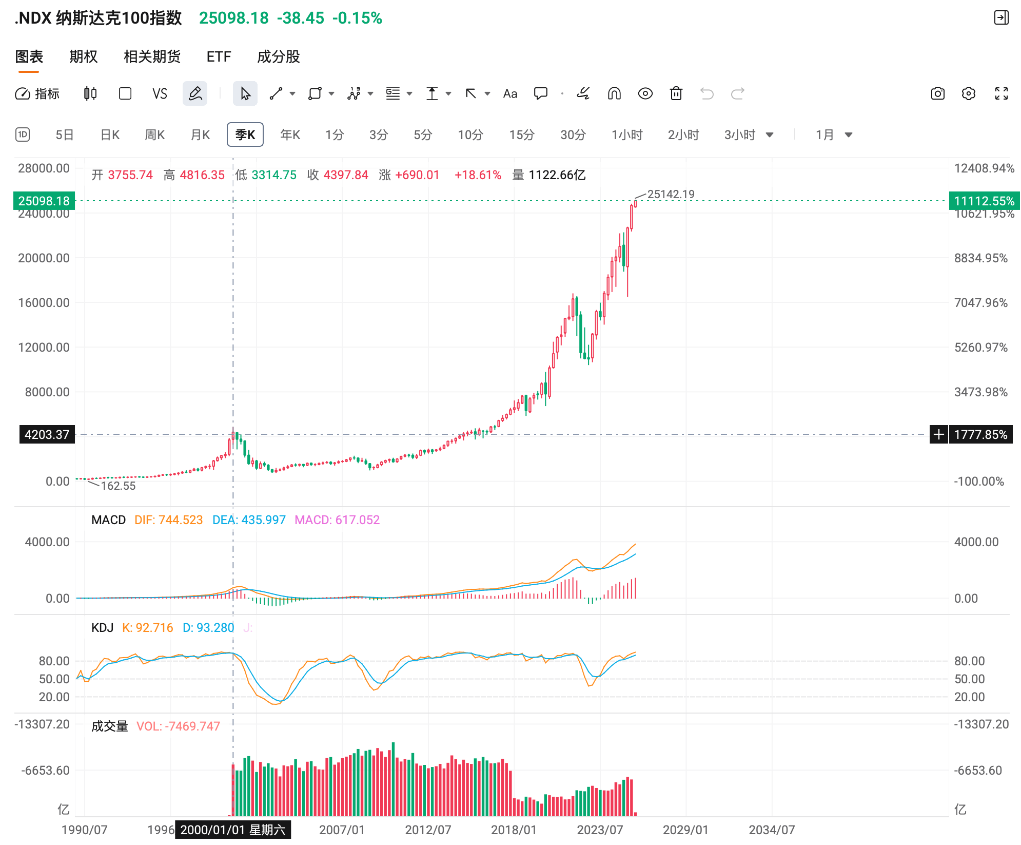 但是现在早已不是2000年,纳斯达克100指数的股价也已经是2000年互联网泡沫高点的6倍之高,现在过分的对照2000年的情况未免太过于刻舟求剑了