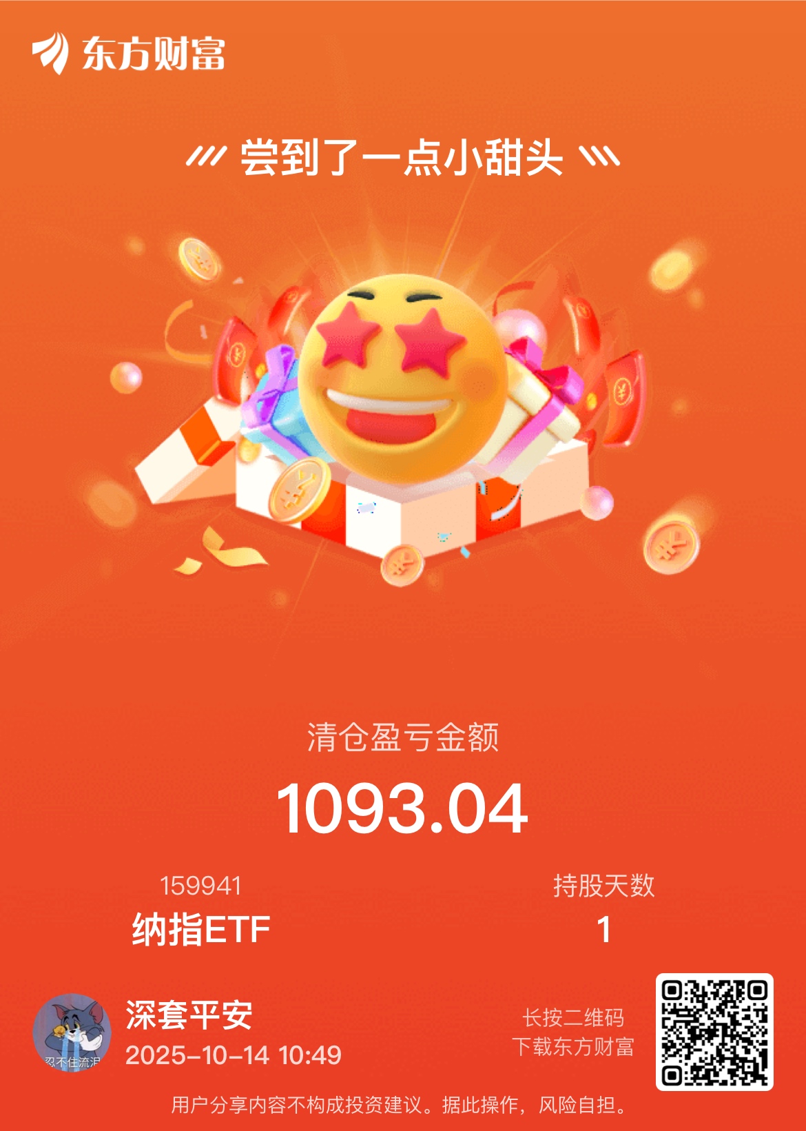 $纳指ETF(SZ159941)$ 昨天买的,清仓了!小赚点生活费!