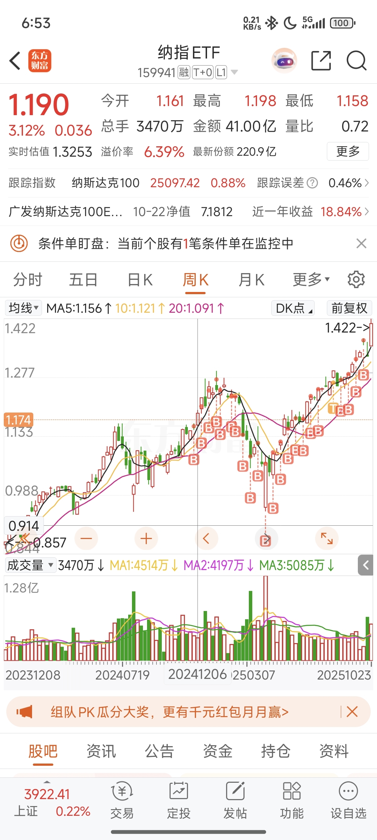 $纳指ETF(SZ159941)$ 定投快1年了,无脑拿这就好,刚买的时候溢价8个点几个月,最多时亏20多个点,现在盈利18个点,做时间的朋友